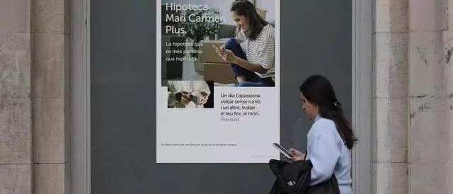 Una dona camina davant d’un cartell publicitari sobre hipoteques, en una imatge d’arxiu. / FERRAN NADEU