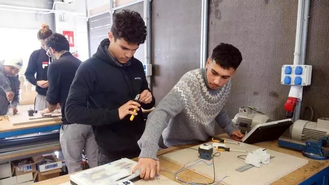 Joves que participen al programa fent pràctiques d'electricitat / Xavier Pi (ACN)