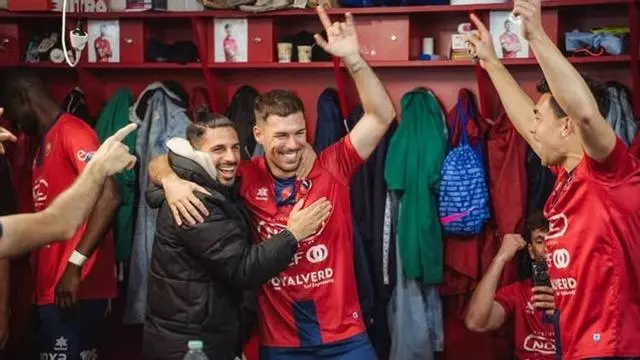 Enri celebra el hat-trick i la victòria a ritme de rock&roll amb els seus companys de l’Olot. / UE OLOT/Pau González