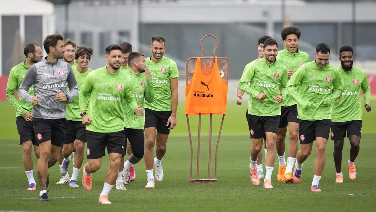 Els jugadors del Girona es mostren contents en l’últim entrenament abans d’enfrontar-se al Barça. / David Borrat/EFE