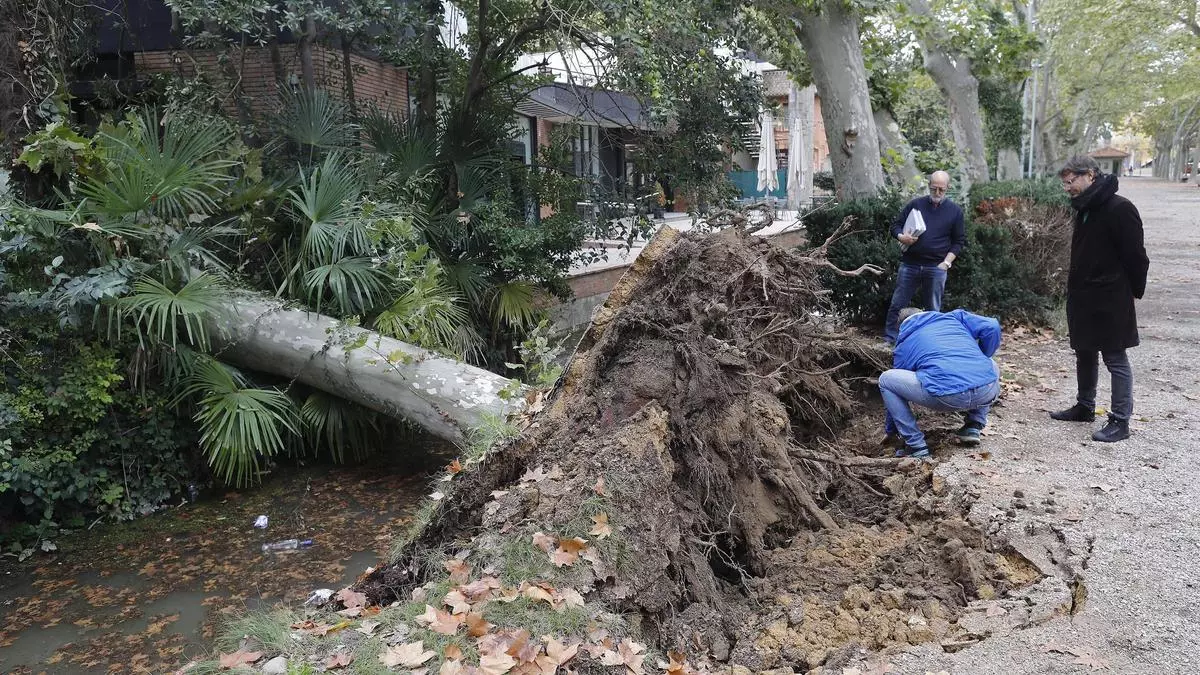 Talaran un plàtan al parc de la Devesa de Girona amb risc de caiguda a la zona on en va tombar un dissabte