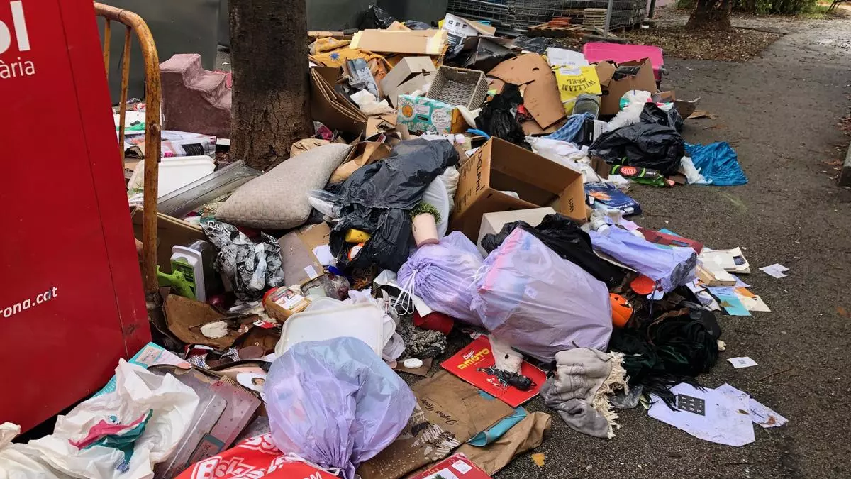 Deixalles acumulades a l’exterior dels contenidors davant de l’església de Sant Pau, aquest dilluns. / Redacció